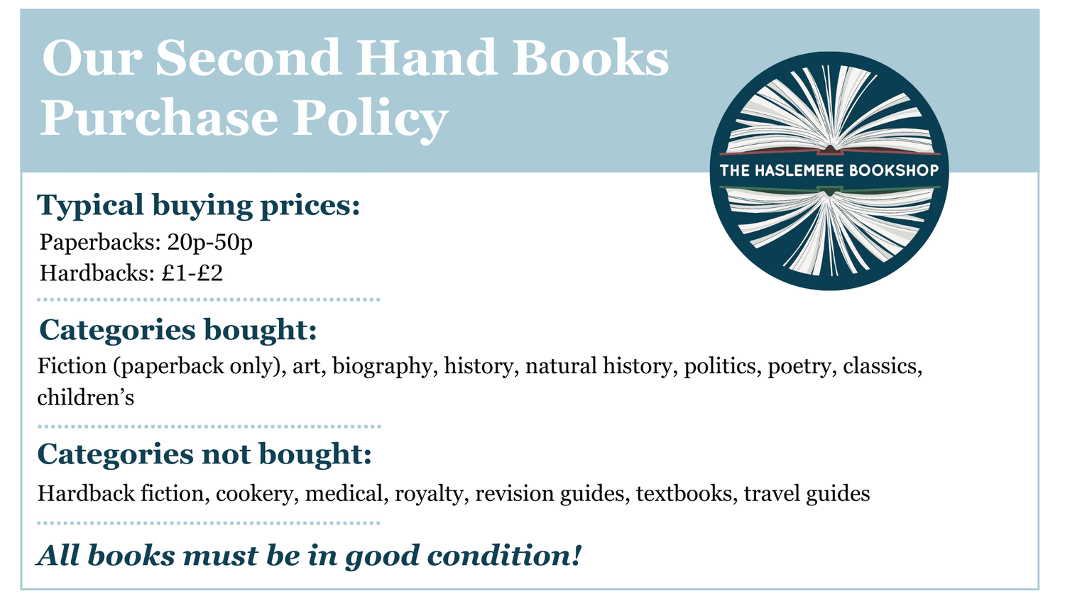 If you would still like to pass on your books to us, our purchase policy is below: